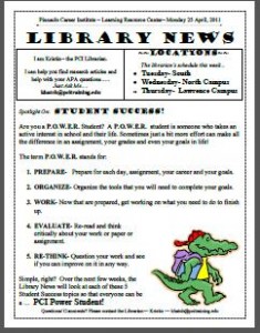 You can read the Library News Newsletter in each of the Learning Resource Centers OR click on this link to read online: Library News.25April.POWER.intro